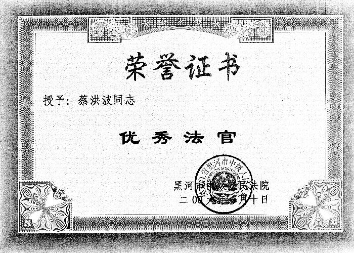 蔡洪波同志被黑河市中级人民法院评为“优秀法官”