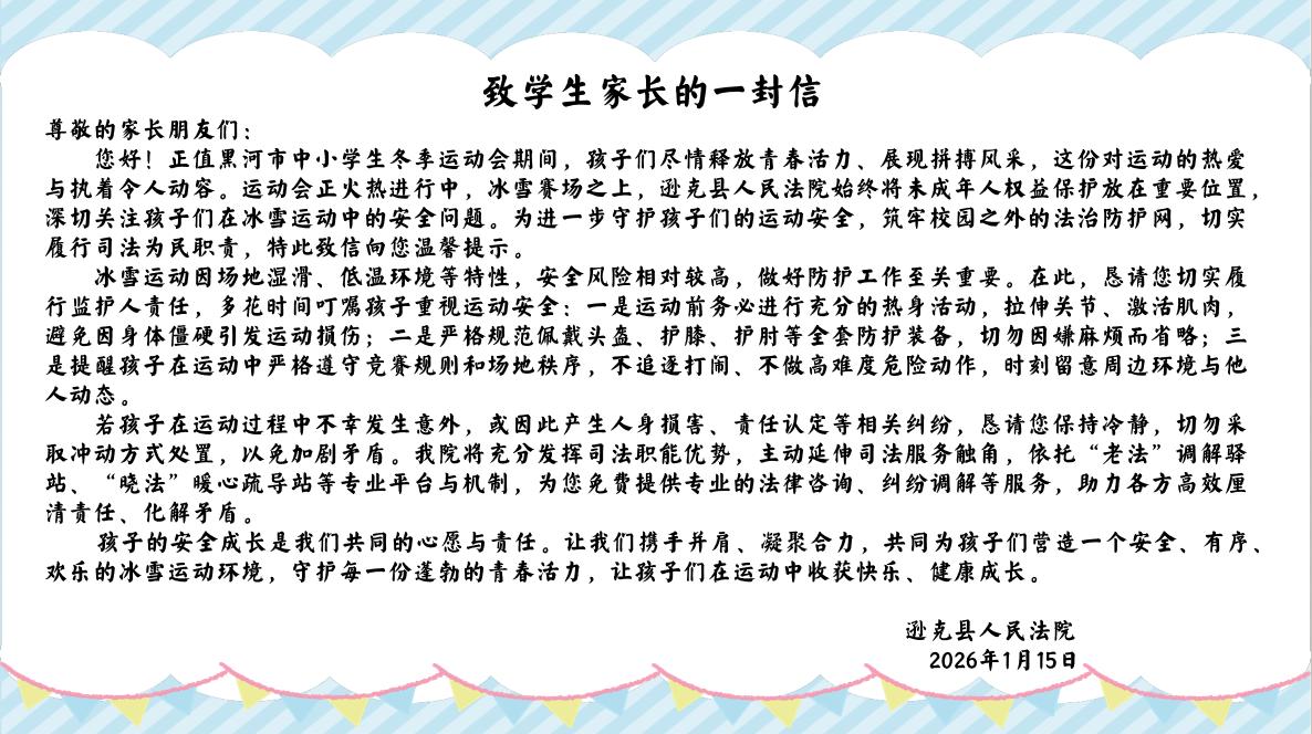 正值“冰超”2026年黑河市中小学生冬季运动会暨“燃情冰雪 炫彩足球”第四届青少年户外体育活动营地冬令营在逊克县火热举办之际,逊克县人民法院聚焦冰雪运动安全防护重点,以司法为民举措筑牢校园外安全屏障,向广大家长发出《致学生家长的一封信》,为孩子们的运动安全保驾护航。