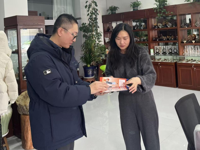 活动中,干警走进玛瑙商铺,与经营者面对面交流,详细了解门店经营状况、交易模式及法律需求,重点围绕买卖合同签订、消费纠纷化解、用工风险防范等内容,用通俗易懂的语言讲解相关法律知识。针对玛瑙采购、加工、销售各环节可能出现的法律隐患,干警结合典型案例拆解分析,提醒商户规范交易流程、留存交易凭证,避免因合同漏洞、侵权行为遭受经济损失。
